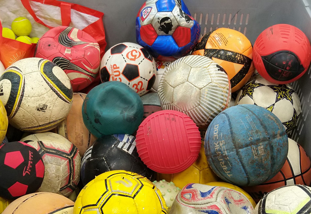 Les casques de vélo, balles de tennis ou ballons en mauvais état sont à déposer dans un